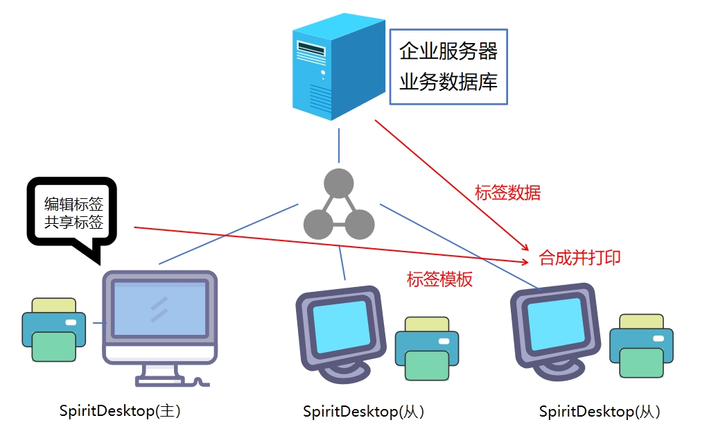 在企业内网安装 SpiritDesktop,该软件集标签编辑、标签打印为一体,功能与在线版本打印精灵基本一致。 安装时,一台机器作为master,其余机器作为Slave, master和Salve安装的软件完全相同,仅配置不同。